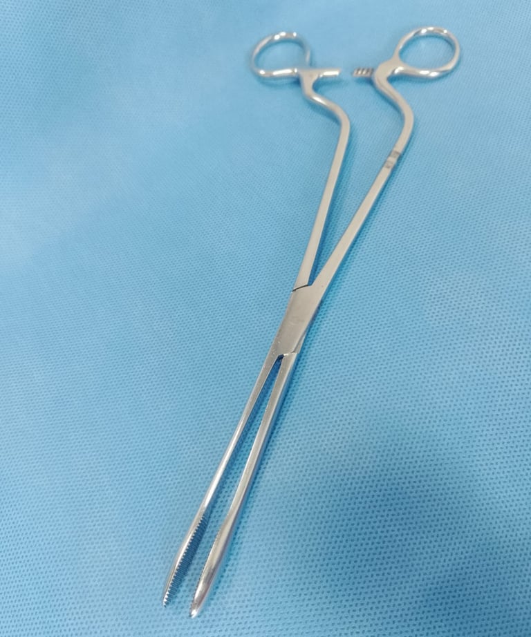 A pinça Cherron é usada no início da cirurgia, principalmente para auxiliar no preparo do campo operatório. Auxilia no manuseio de compressas pequenas sem comprometer a assepsia da pele antes da incisão. Após o uso, não retorna para o campo estéril, pois já teve contato com a pele do paciente.
